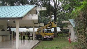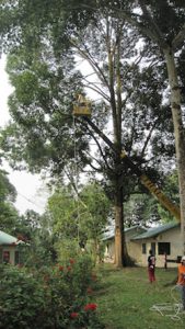 Another smaller tree had to be felled to enable the hired cherry picker to access the Hopea odorata, manoeuvring into position in the tight space between the buildings. After Raya we will hire the cherry picker again to remove all split trunks along the driveway, retaining just the strongest.