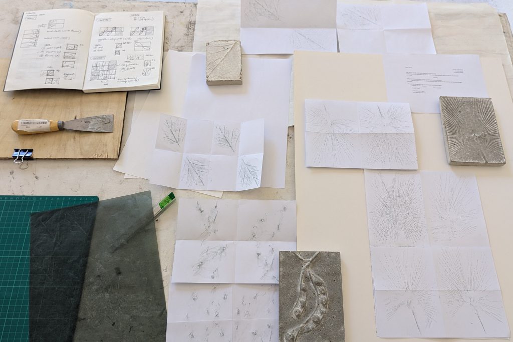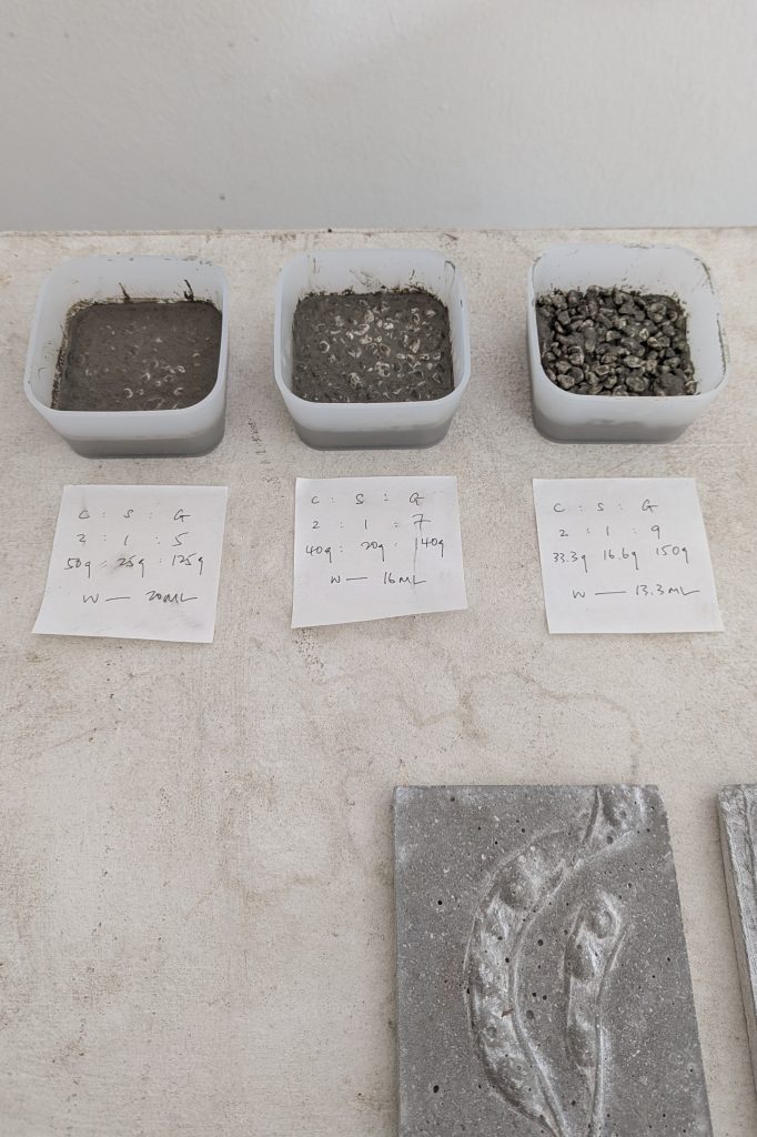 In one series (‘coarse copy’), I made casts and bricks out of Shanghai plaster, a faux-stone finish made of stone aggregates held together in a cement-binder that results in a rough, speckled texture. As a material introduced by Chinese labourers hired to construct many of Singapore’s classically inspired buildings, Shanghai plaster embodies the material culture of labour histories and transmission. In the work, the bricks are cast patterns of botanical specimens selected from Rimbun Dahan’s native garden, their impressions read against the grain of the textured plaster. The bricks form a pedestal, presented as a pattern book of alternative ornamental motifs, indexing botanical taxonomy alongside Vitruvius’ architectural myth of the column. The coarsened medium of this casting technique challenges the assumption of fidelity, drawing attention to how imposed forms require local hands to make—and remake—them, their labour an act of translation.