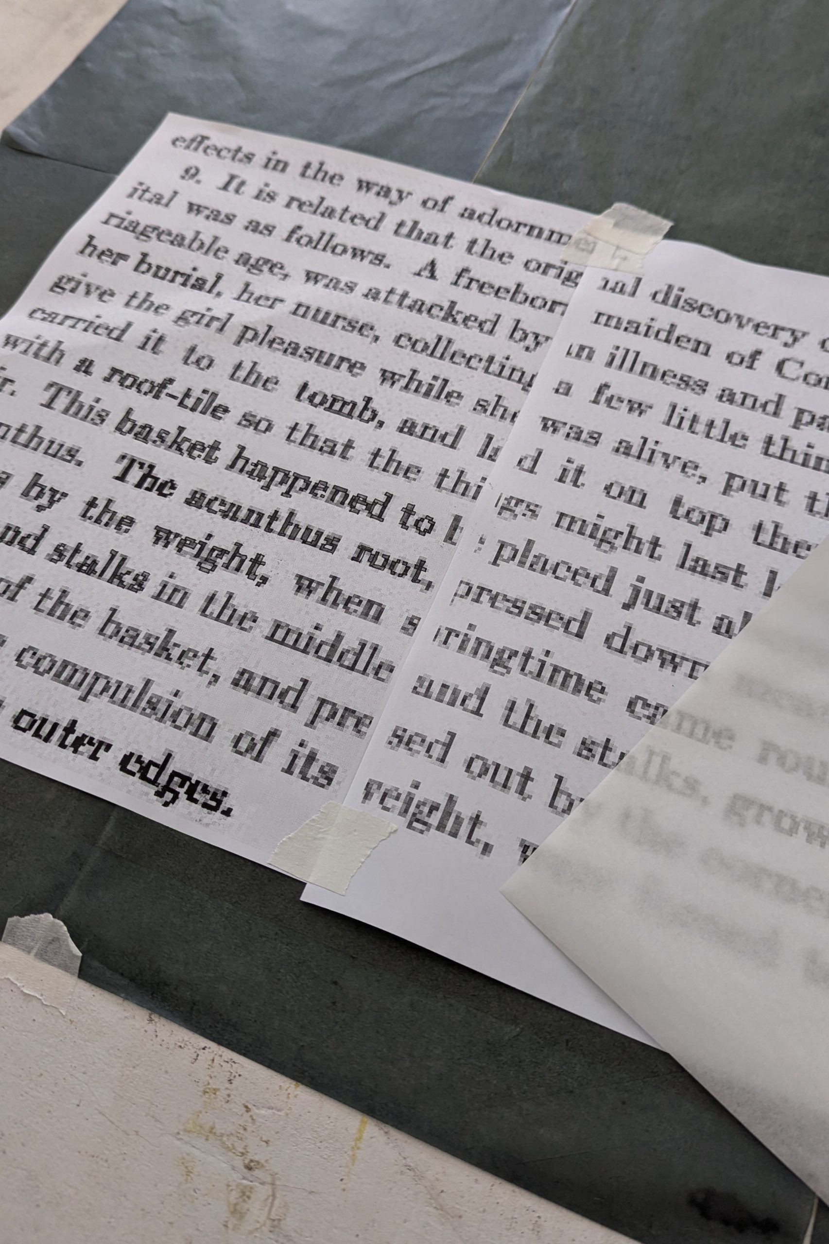 In another series (‘carbon copy), I worked with carbon transfer paper to manually copy text. Using a basic black-and-white printer, I printed out copies of Vituvius’ architectural myth, sourced as a low-res scan from the Internet Archive. Enlarged tenfold, the text rendered as pixelated fragments, which I then copied by hand. The letters began to blur into artefacts. This exercise draws from the attitude towards copies and imitation in Eastern art, such as the copying of calligraphy masterpieces, where reproductions are often regarded with equal (or even greater) value than the original.
