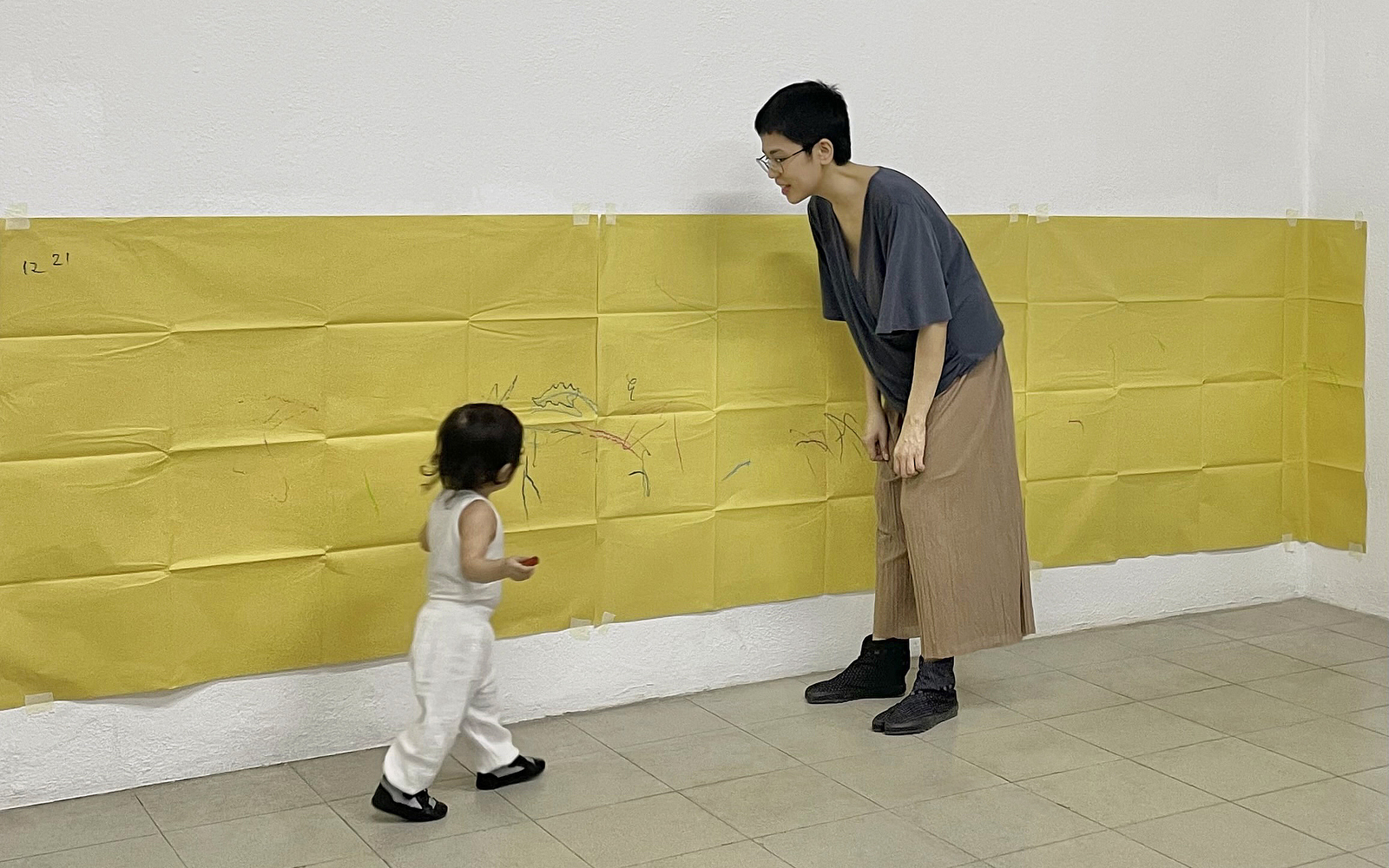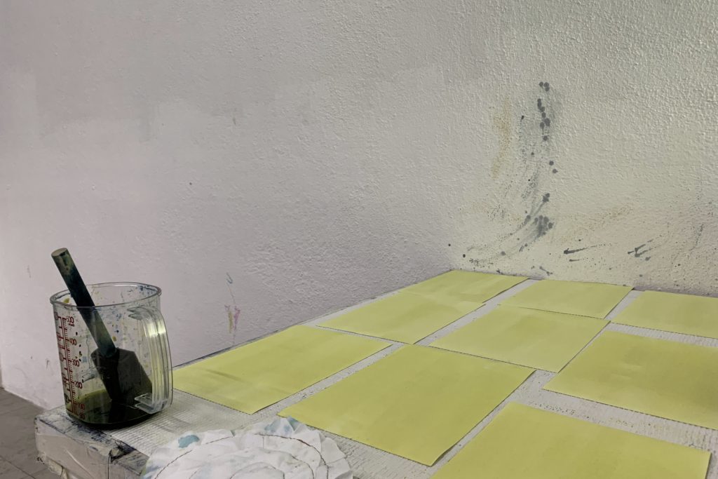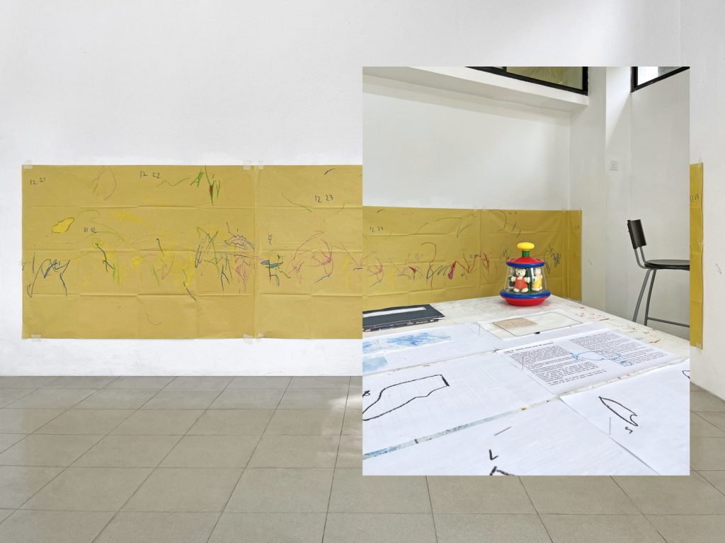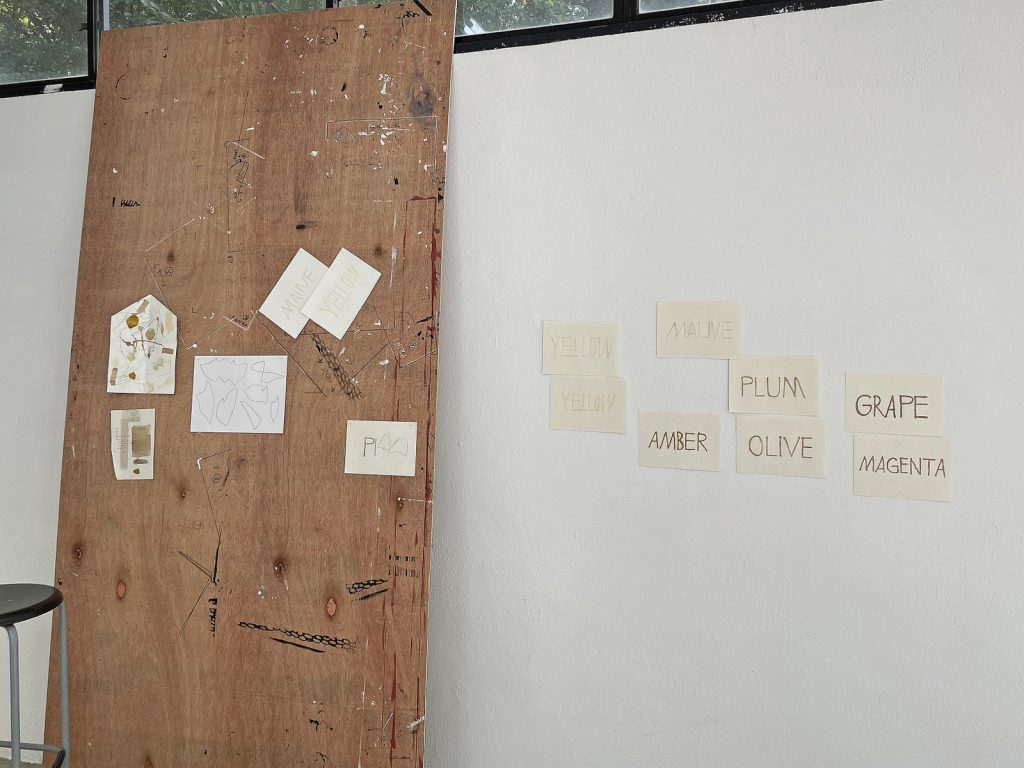 Meanwhile, in the studio, my partner mounted sheets of manila paper on a wall, for Laia to draw on and entertain herself with while I worked. Before long, I noticed that there were accidental closed shapes in her doodles. As I filled them in using her crayons, it occurred to me that closed shapes are formed by two ends meeting or touching, and, more crucially, how touching is very mammalian. I have been thinking a lot about touch lately, ever since coming across the counterintuitive and anti-touch regimens of sleep training infants. Going through the motions of my internal conflict, I decided to catalogue Laia’s closed shapes. No sooner had the inks finished curing than I figured, with some creativity, that I could write “mammal” with her shapes, and test the inks at the same time by doing so. In the end, what I had to show for my time at Rimbun Dahan were works (or non-works (or fun-works)) that represent a range of productivity without having to compromise one’s ability to parent***. Although very outwardly different from the controlled and monochromatic image- and object-making I am used to, the mammal series, from the ink drawings to the existential colour chart, may just be the most meaningful project I have started so far. My paradigm is shifting and collapsing unto itself: the personal is professional, and they should not be far apart.