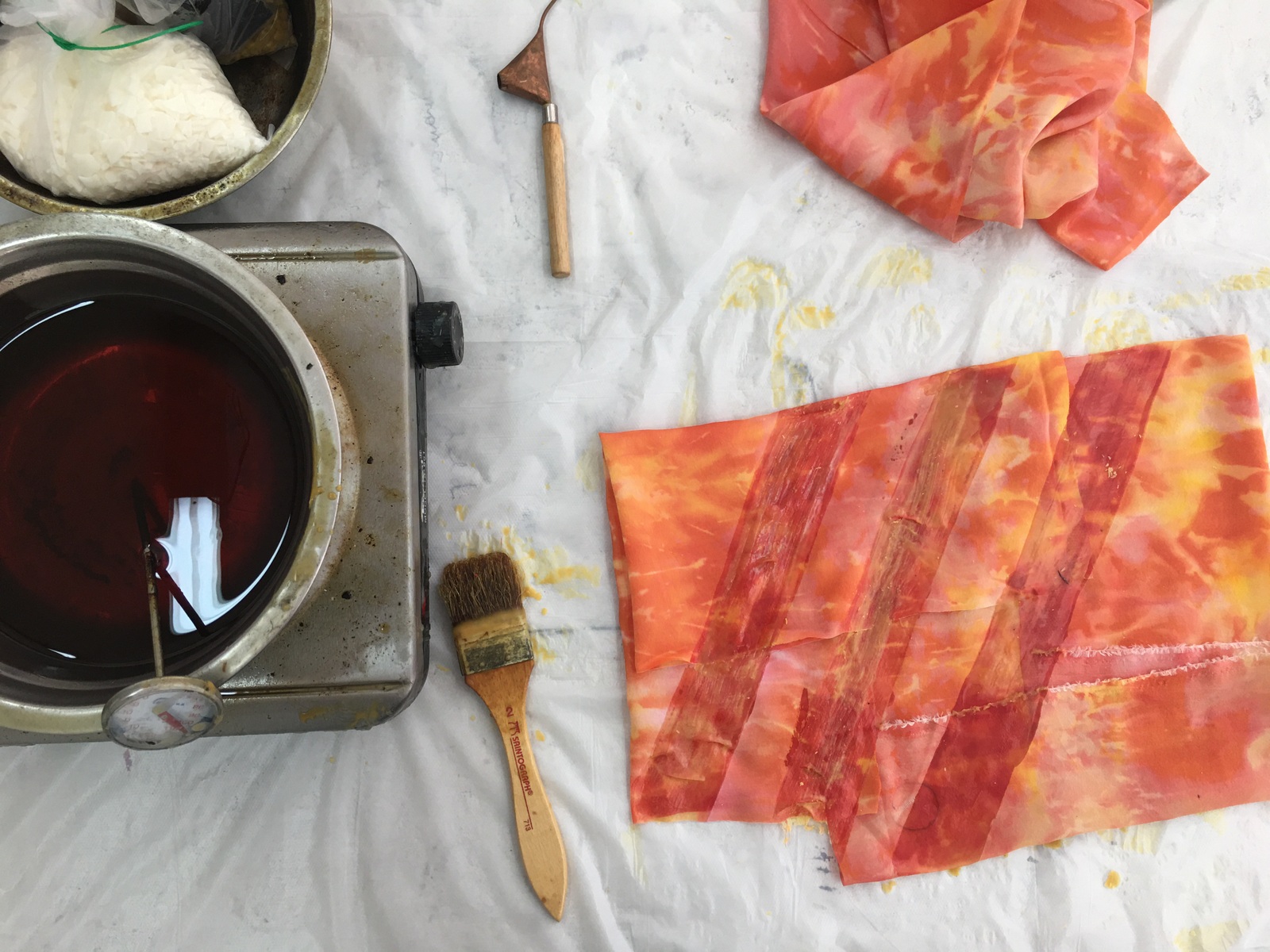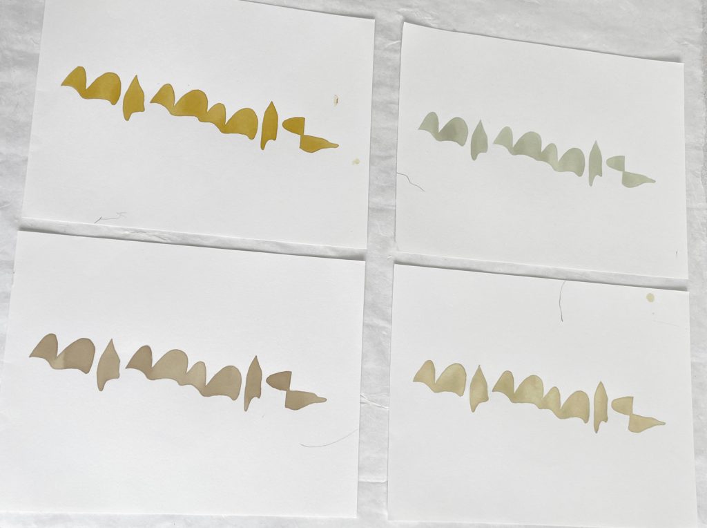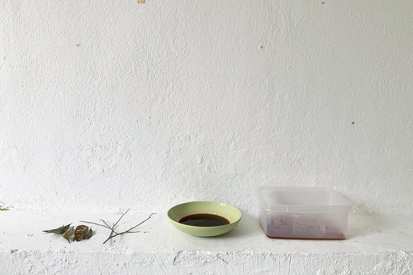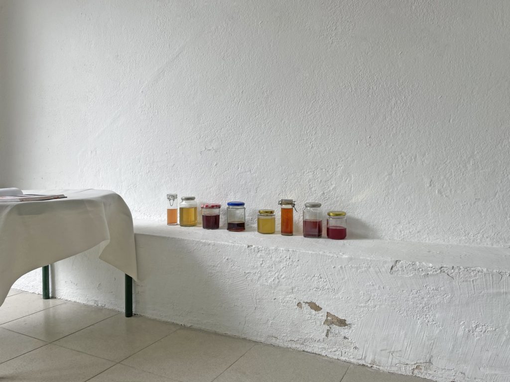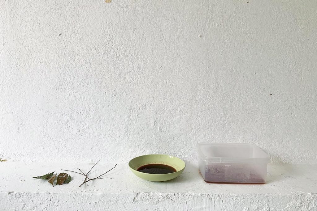In the kitchen (not the studio), the tension would be momentarily resolved. There, the work took care of itself while I took care of Laia. I found myself trying my hand at making natural inks, leaving pot after pot of plant material foraged from the grounds to cook for hours at a time, only stirring occasionally. Out of the ten different plants I cooked, seven gave me sufficient and effective yield**. I learned surprising things about natural pigments: how green is hard to come by, and how colour changes not only across time but also physical states (one magenta ink from a small, red, fleshy, pitless fruit dries blue-green). Despite being dazzled by the aliveness of the inks, I caught myself describing them as unstable in my notes, and then realised how the language of commodification, wherein consistency is king, was a kind of default. There might be more unlearning to do than learning.