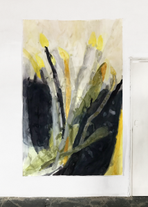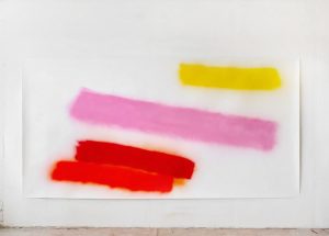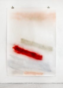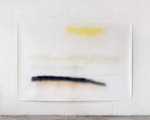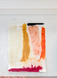 “I work with a feminist approach towards abstract painting exploring the idea of the feminine, its materiality and the meeting between feminine and masculine art traditions. Through monumental spray paintings and watercolours I investigate a soft, transparent materiality in painting on paper. With a minimalist use of the spray paint, I challenge its wellknown grafitti aesthetics. In watercolours, I work with immediate, fluidity which, through its scale, aim to question the medium’s associations to its amateur, lower status in the art world as well as a “ladies’ medium”.