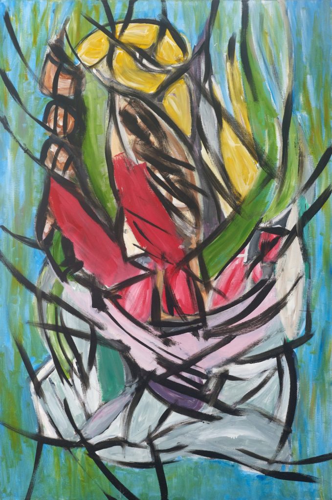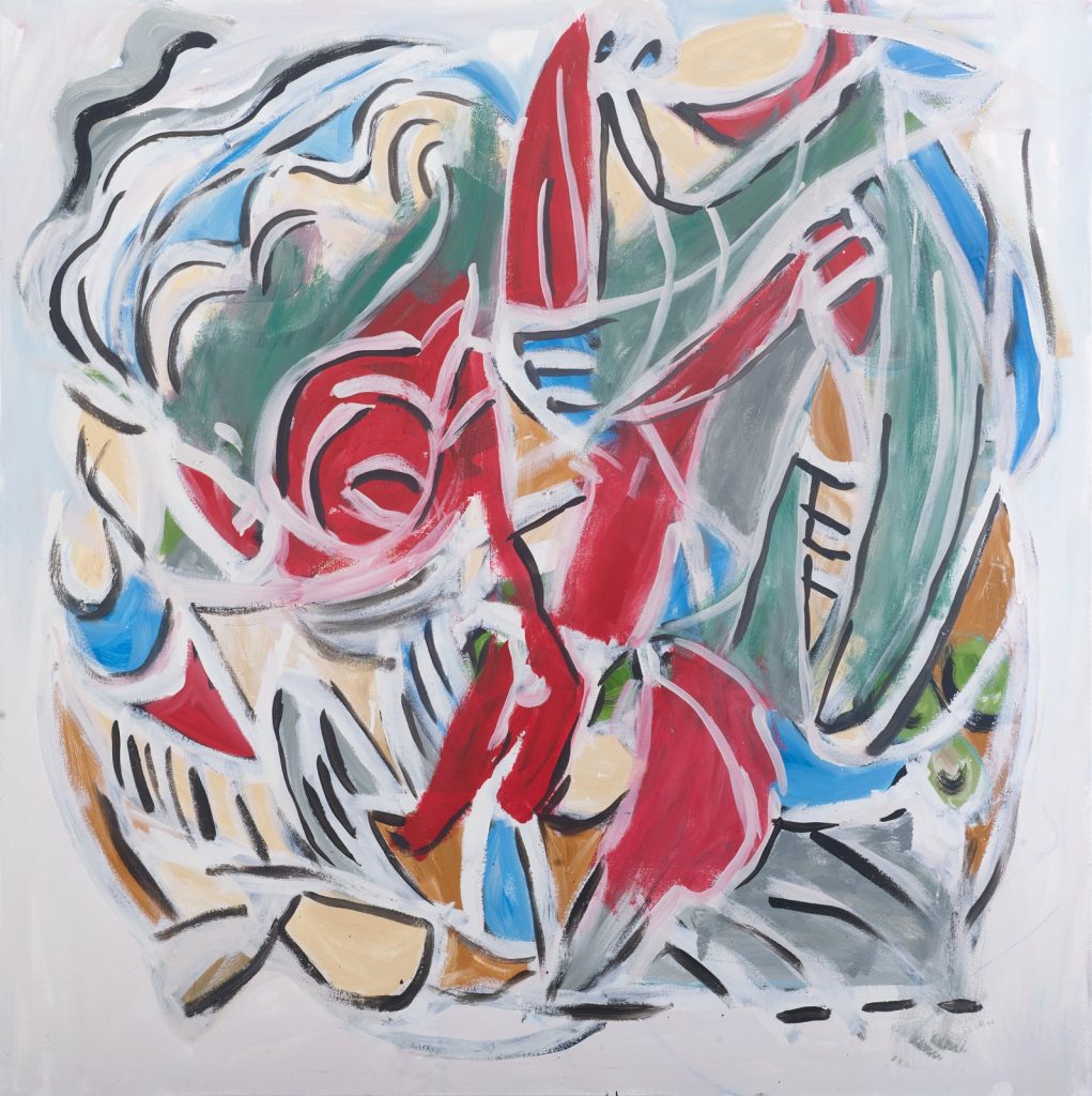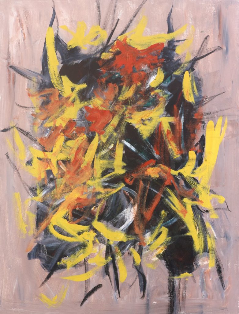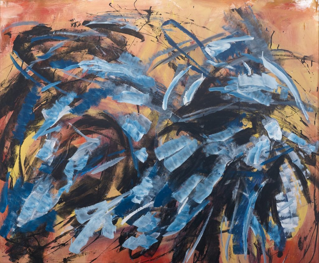 Another facet of his background is his fondness for quoting Shakespeare. Macbeth is one of his favourites. Looking at these works, the witch’s exhortation to “Be bloody, bold and resolute” comes to mind. My father has never been timid or hesitant. The exuberant energy of his artworks comes from a deep well of personal resilience. He cannot tell you what he is thinking about when he makes art, and by and large he doesn’t plan his works. They come to him spontaneously, when he has a brush in hand, paint pots at the ready.