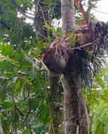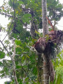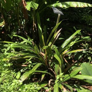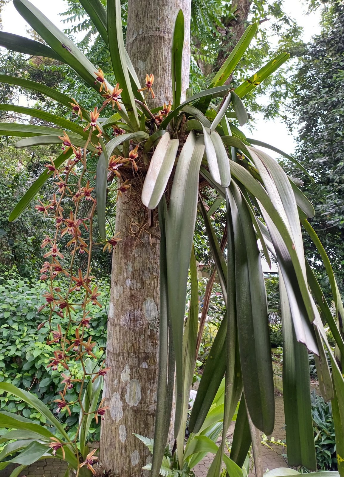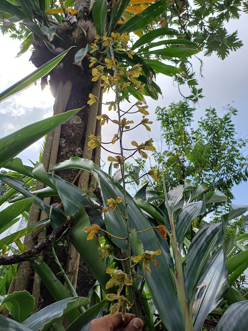 Native to Southeast Asia, often found in coastal habitats. Large, produces a long inflorescence which dangles yellow green flowers with brown markings.