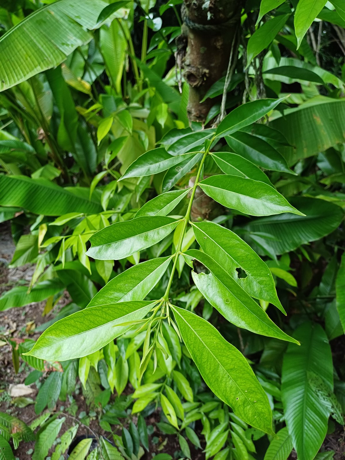 Like rambutan, but leaflets narrower, dark glossy green above, pale & glaucous beneath. Crimson to purple fruit with blunt fleshy spines. Pulp pale yellow, separates cleanly from seed.