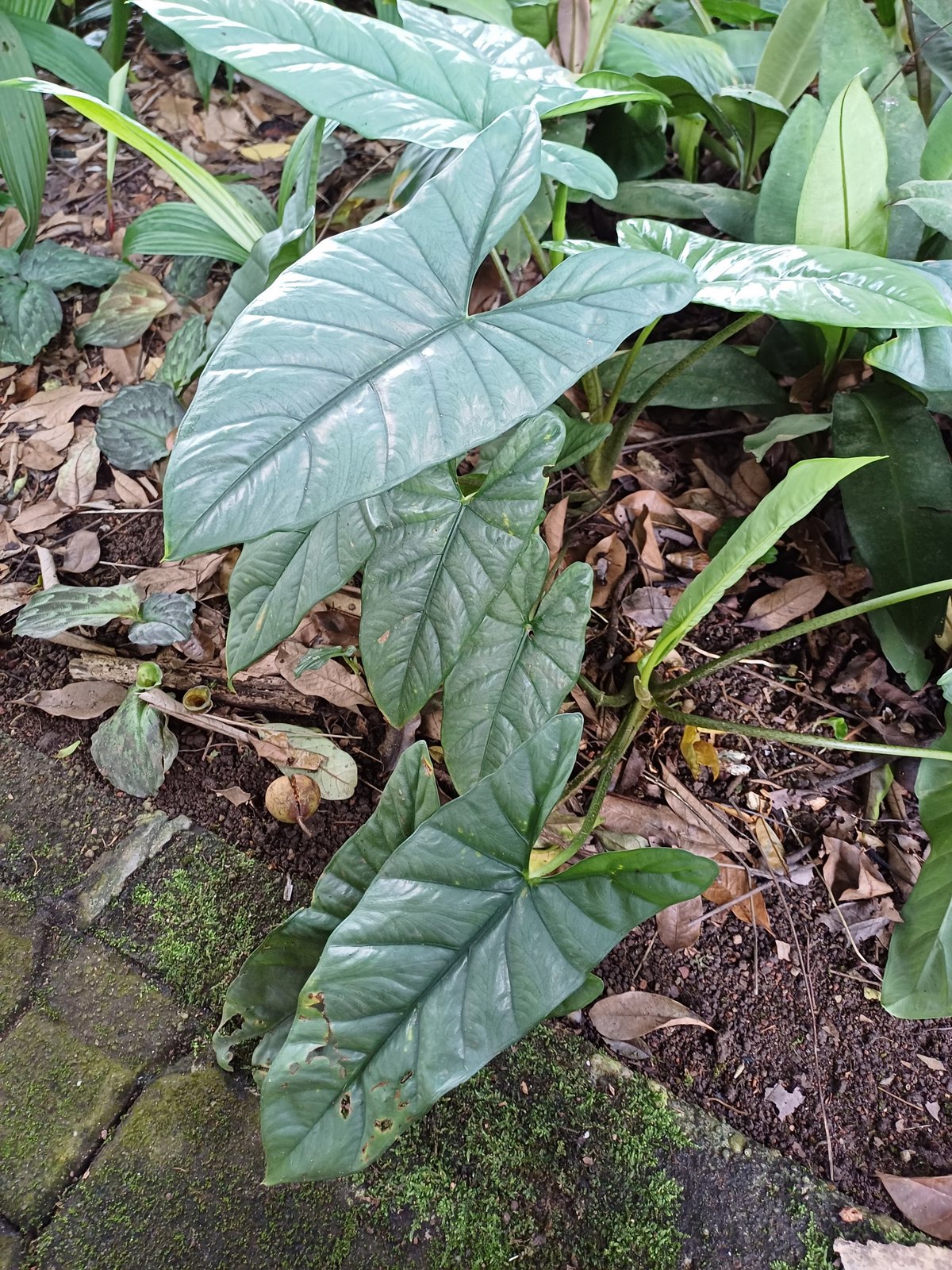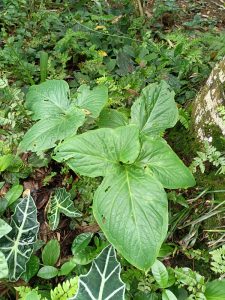 Alocasia macrorrhiza ARACEAE, Arum family birah, senteh Sri Lanka? Naturalized through the tropics. Toxic & must be cooked to remove poison. Treats TB, fever, typhoid, snake & insect bites. Stems famine food. Gimlette: the juice relieves stings of giant nettle (Laportia), & Skeat: leaves for magic cure. Ornamental, but Burkill says ‘it is scarcely this’.