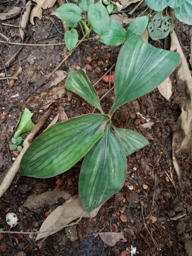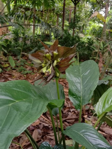 Common tuberous herb in deep shaded forest. Flowers arranged in clusters of 5+ surrounded by leaf like bracts, with pendant thread like bracts. Pulped tubers treat skin irritations caused by ulat bulu darat, stinging black caterpillars (Bentong).