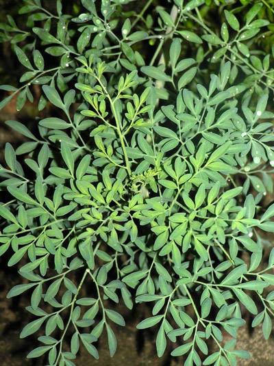 Ruta graveolens RUTACEAE rue, inggu, geroda S. Europe, N. Africa, no longer found in the wild. Bitter, acrid, cool. Anti-inflammatory, dispels stagnant blood, analgesic. For colds, fever, infantile convulsion, amenorrhea. Infantile eczema. Traumatic injury. Snake and insect bites.