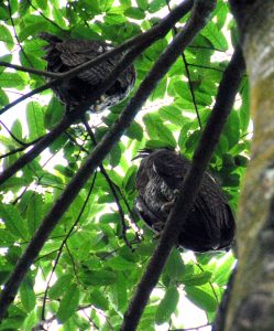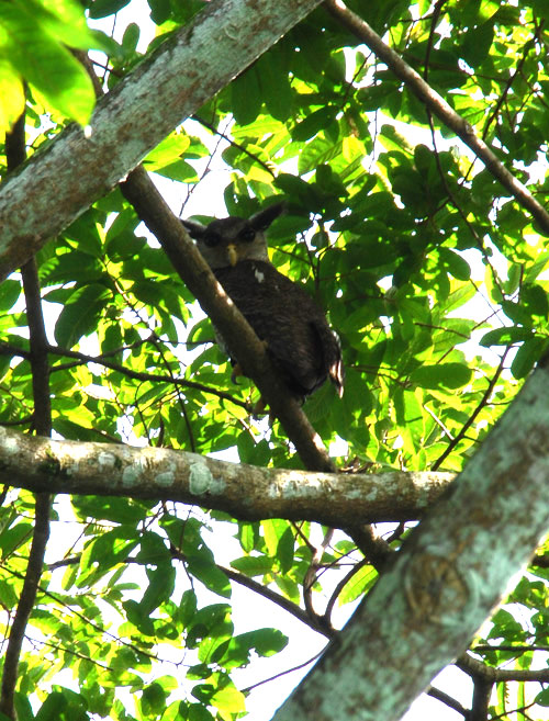 The eagle-owl has been seen several times resting in the same ipoh tree, Antiaris toxicaria, beside the steps of the dance studio, gripping the branches with its enormous yellow feet. Once two individuals were observed sharing the same tree, enjoying a communal snooze.
