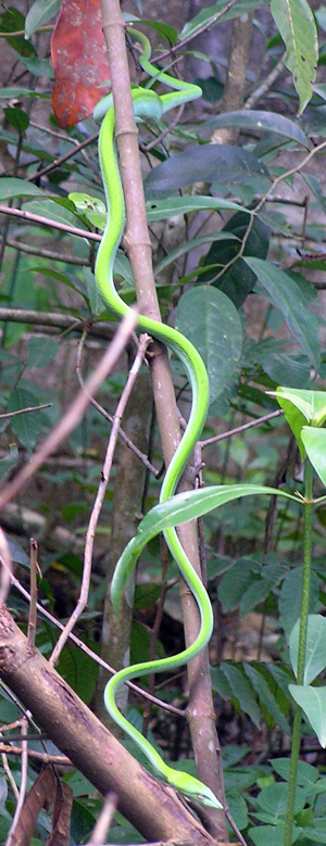 The brilliant green of this snake drew my attention to it as I walked through a deeply shaded area of the garden; fortunately it stayed motionless for the camera and the dogs didn’t disturb it. They are mainly tree bound but can sometimes be seen on the ground, and according to the text cited below they can be picked up with little risk of being bitten. It feeds on small birds and lizards, and has the curious habit of sticking out its tongue for a long time. About 4 to 6 young are born in a litter and they are light brown in colour. The young feed on flies and small lizards, and attain a length of about 2 m when fully grown. This species is common in Singapore and Peninsular Malaysia.