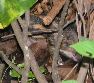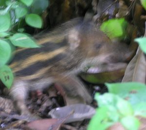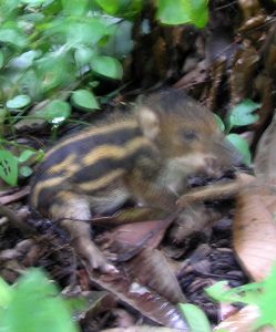We have had occasional instances of wild boars at Rimbun Dahan, although these are fewer now that we have fixed a few holes in the fence. They come from the surrounding abandoned rubber estates, where they are hunted by weekend warriors for food. Wild boar piglets are striped, whereas adults are not — this is thought to help them stay camouflaged. Usually wild boar sows with piglets are particularly defensive of their young, and can inflict ferocious wounds although, unlike the male boars, they have no tusks.