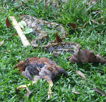 This morning we had a snake alert: python in the hen house, again! This time three dead birds, one already consumed, two lined up ready to be eaten. When the snake was bagged, Lubis estimated its weight at 6 kilograms, including the eaten chook, as it didn’t have the amazing foresight of our last python who realized if you chuck it up, you might escape. This one was captured and released near a local stream with dinner to digest.