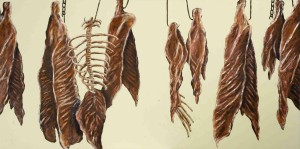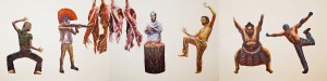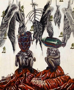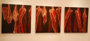 Questions like these are explored through the use of figuration in Lim’s new works. In the case of the largest painting Gods, Heroes and Myths, the figures press upon the viewer, popping to life from a pristine flat background. Using the parade of characters, Justin highlights a number of ambivalences and paradoxes. Sumo and American wrestlers are a source of entertainment but are also treated as heroes by many in their home countries. So, how seriously should they be taken by us? Two other figures strike dance-like poses with eyes half-closed. Are they dancing or going into some sort of trance – one is never quite sure. There is a man sporting a Mohawk haircut and punk clothing. As an icon of anti-establishment counterculture, he takes silent aim at the central figure in the picture. A butcher, with knife in hand, who stands amidst hanging carcasses, looks at the viewer quizzically. He wears a white rounded cap, usually associated with the taqiyah worn by Muslim men. How do we regard this enigmatic character? In an age when terrorism-driven fears have exacerbated irrational exaggerations and stereotyping, where is the place for truth and tolerance? In the work Animal Farm, Lim takes inspiration from the book by George Orwell, a cautionary tale about power and corruption. Featuring a line-up of animal carcasses stripped of all marks of identity, the painting seems to be reminding us that regardless of our desires, convictions and achievements, this is the ultimate destiny for everyone – to become mere remnants of anonymous flesh, nothing more, nothing less.