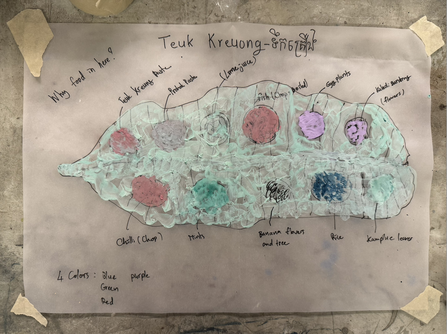 The title of the interactive performance is Terk Kreung. This is also the name of a traditional Cambodian dipping sauce, often known simply as Kroeung (គ្រឿង). The artists will introduce the audience to Kroeung at the Open Studio.. This Khmer cuisine, prepared with fresh fish, sour notes, chilli, and colourful vegetables sourced from Rimbun Dahan and Pasar Kemboja, as well as keladi bunting flowers, explores shared ingredients, taste, memory, and the longing to belong. It reflects both the artists’ experiences and the lives of the Cambodian community living in Malaysia. The act of preparing, sharing meals, and eating collectively on the floor embodies the spirit of family, warmth, and a profound sense of home.