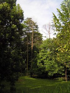 The main objective in the planting programme at Rimbun Dahan is to develop the highest canopy possible, not always easy when trees tend to branch out as soon as they reach clear light. To encourage monopodial structure for as long as possible, we prune side branches and force the trees up by dense planting. Inevitably this has made them the tallest structures in the neighbourhood, apart from the DiGi tower on an adjacent block, and they are vulnerable to lightening. Two trees were lost on different occasions, a durian on the right-hand side and a Sterculia (fortunately not an indigenous species). We lose four or five trees a year, but then we have an open space where we can plant something else, in a ready-made ‘tube’ for rapid vertical growth.