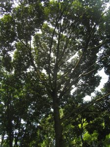 A row of ten jelutong, Dyera costulata, was planted in 1999, but only six survive. Their dimensions range between 24″ and 50″ (24, 37, 42, 44, 47, 50).