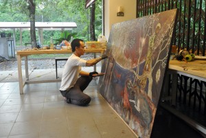 Le Thua Tien has a diverse art practice that includes paintings, installation, experimentation with sculpture and community based art projects. The direction of Tien’s paintings changed from figurative to abstract when he arrived at the Rijks Academy in Amsterdam in 1995. Some of his most recent works are mixed media and lacquer and can be considered symbolic of his subjects. He is one of Vietnam’s few artists who address the American War in his works. His work also tends to be more conceptual than many other Vietnamese artists. His work has been displayed in the United States, Thailand, the Netherlands, France, Germany, Venezuela, Japan, and Australia. Le Thua Tien lectured at the Fine Arts University in Hue, Vietnam, from 1989 to 2008. He now lives and works in Hue.