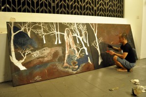 Tran Dan studied architecture in university, but his artistic career is built on self-taught painting and sculpture. His primal medium is lacquer, which is widely represented and used in Vietnamese traditional and modern arts. Tran is keen to further develop its form and use in art: lacquer with/as mix-material paintings/sculptures or (video) installations. He has made full use of Rimbun Dahan’s gardens and surroundings for materials to make into lacquers and paints. His collaborations with foreign cultural institutions in Vietnam, such as British Council, Embassy of Denmark, L’espace French Cultural Centre, and The Japan Foundation Center for Cultural Exchange have resulted in experimental videos and performances about human consciousness, dreams, Vietnamese culture, and food. Tran has also opened an independent art space in Hanoi where he organizes and directs programs for local and international artists. His recent lacquer paintings are inspired by the relationship between humans and animals, and by the power of humans and nature. Tran’s work explores the dreamlike rhythm of life, stories that are repeated every night; this also speaks to existentialism, a theme he consistently returns to.